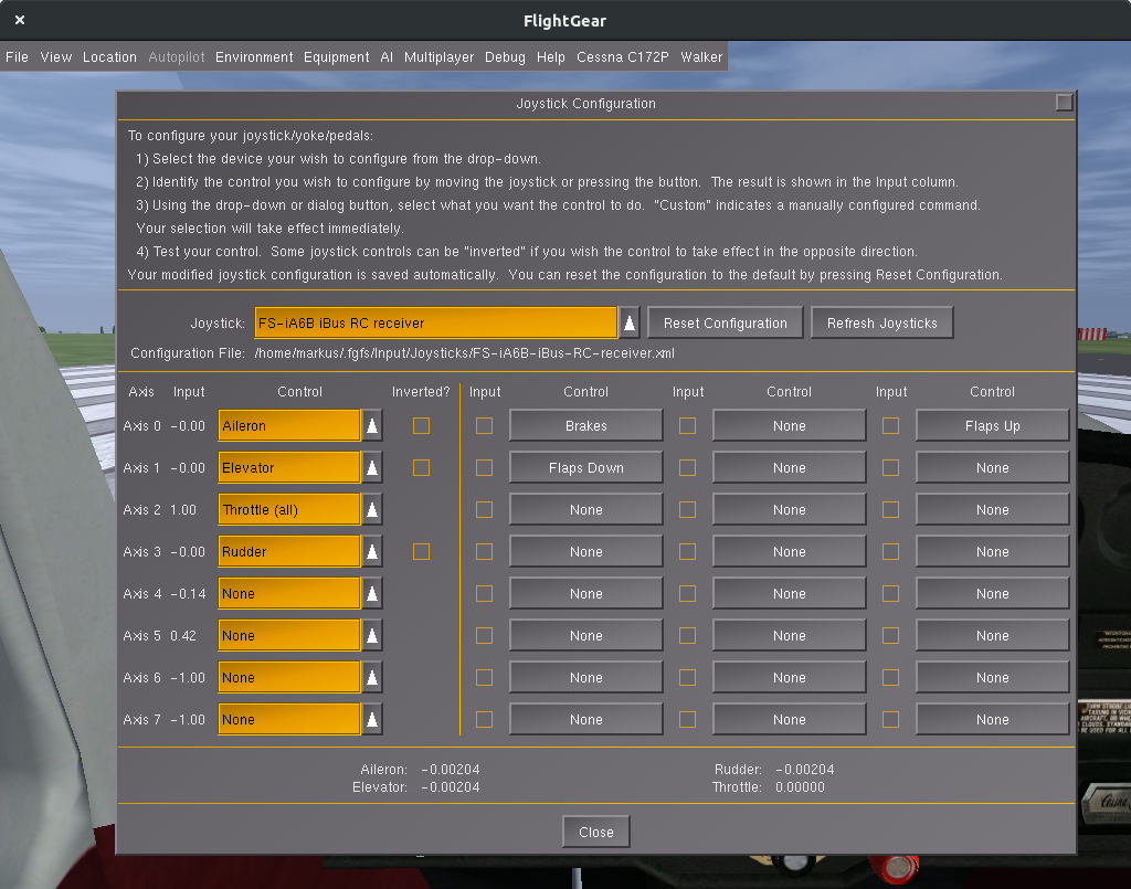 - Throttle is inverted in FlightGear: Go to "Functions Setup -> Reverse" on the remote and change channel 3 to inverted.