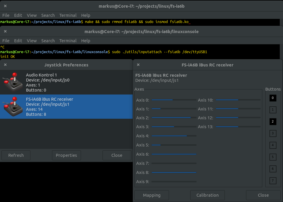 In this post, I will explain how to use the FlySky FS-i6 RC remote control as a game controller / joystick on Linux. This post covers how to connect the FS-iA6B receiver to a computer and how to compile the driver and support software.
