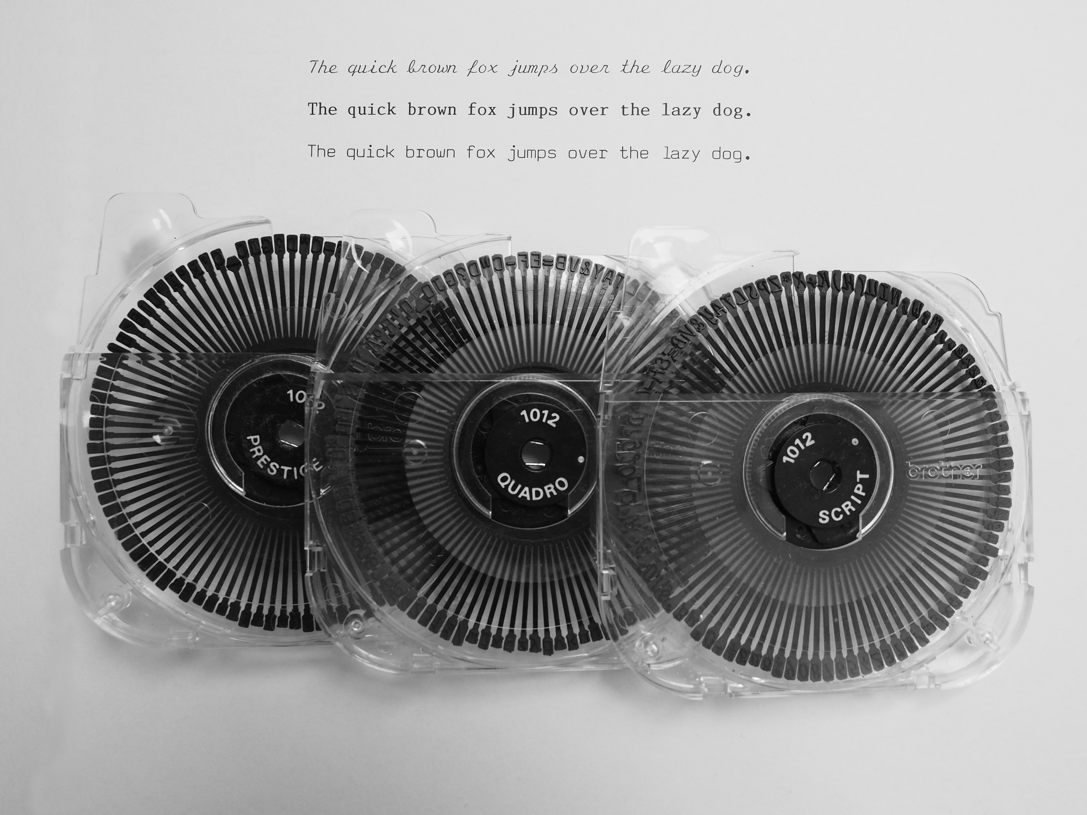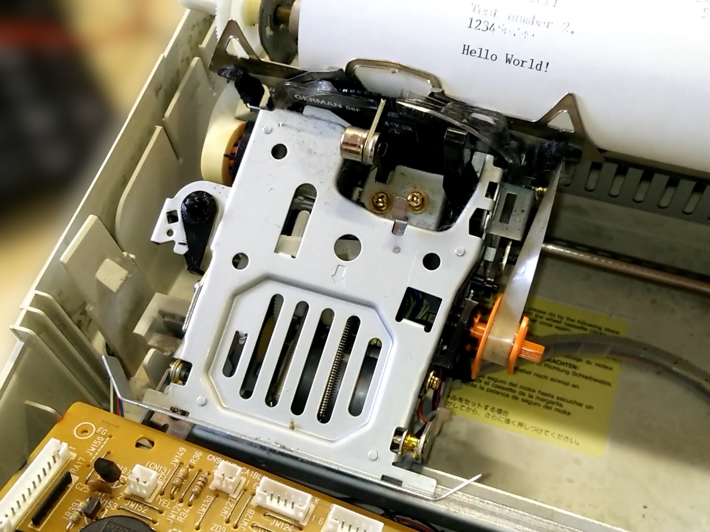 Let me start this section off with a quick explanation of what a daisy wheel printer is, because I suspect that there's many of you who have never heard of this. Modern printers usually work by rasterizing the characters and printing them pixel by pixel. This means that they convert the letter from a path (for example an ellipse for an o) into a set of black and white pixels at the specified font size. These pixels are then individually printed onto the paper at a fixed grid. When this grid is narrow enough, it appears as if a continuous character has been drawn. A daisy wheel printer, on the other hand, has more in common with a conventional mechanical typewriter, where each letter has it's own type hammer with the individual letters milled into the material. Just that the set of hammers is replaced with a single hammer and a smaller rotating disk in front of it, which carries small plates with the characters molded onto them. This has the advantage of a very clean type face, but to change the font, the entire daisy wheel needs to be replaced, which can become quite tedious if there are many different fonts used in a document. The same applies for styles such as bold or italic, although for some things there are workarounds. More about that below. One more note before I move onto the details: These printers don't use ink. Like conventional typewriters, they use ribbons from which the color is transferred to the paper.