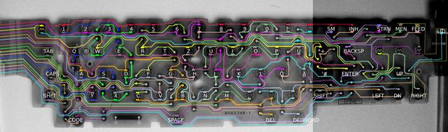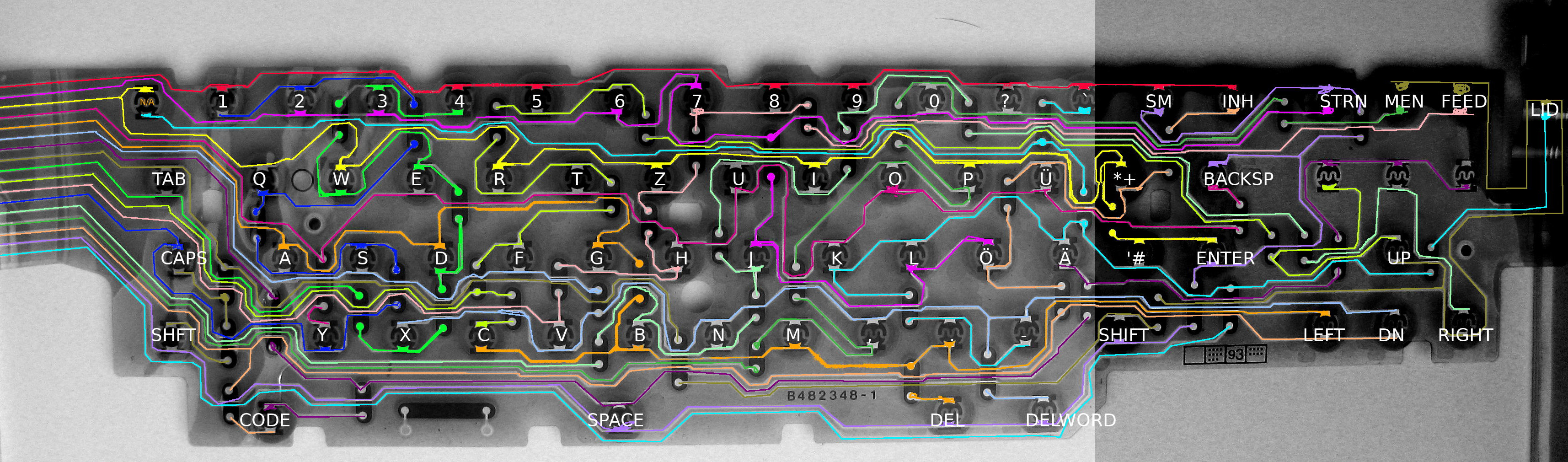The keyboard was by far the simplest part. It was just a matter of figuring out which key connects which pair of the control lines. This was quickly done using a high-contrast image of the keyboard matrix and a (virtual) pen. Then, it all that was left was deciding on how to place special keys -- and some normal ones because their spot was taken by some other key like tab -- and writing the software.