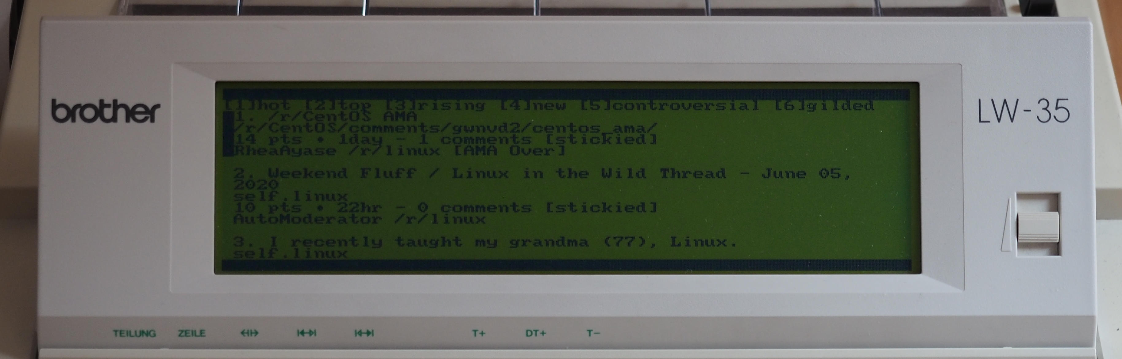 Figure 3. Browsing r/linux on the LW-35 using rtv